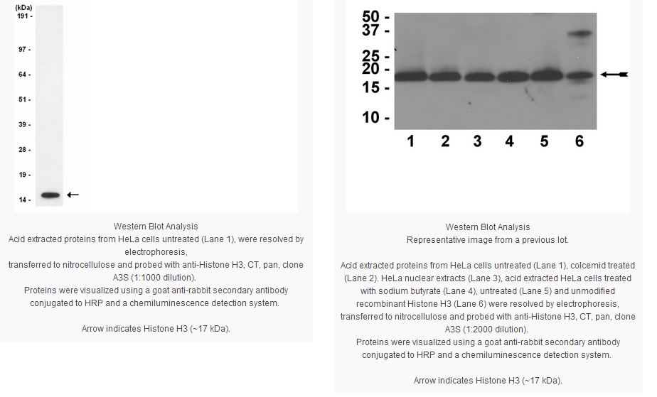 Anti-Histone H3 Antibody, CT, pan, clone A3S is a Rabbit Monoclonal Antibody for detection of Histone H3 also known as Histone H3 & has been validated in ChIP & WB.