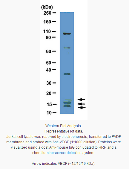 Western Blot Analysis: 1:1000 dilution of this antibody detected VEGF on 10 µg of Jurkat cell lysate.