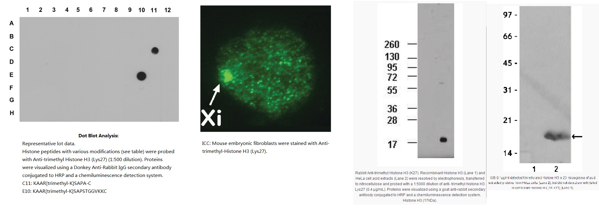 Anti-trimethyl-Histone H3 (Lys27), also known as Anti-H3K27me3, is a highly published Rabbit Polyclonal Antibody. This protein A purified antibody is dot blot tested for trimethylated lysine 27 specificity and validated in WB, ChIP, ChIP-seq, ICC, IP.